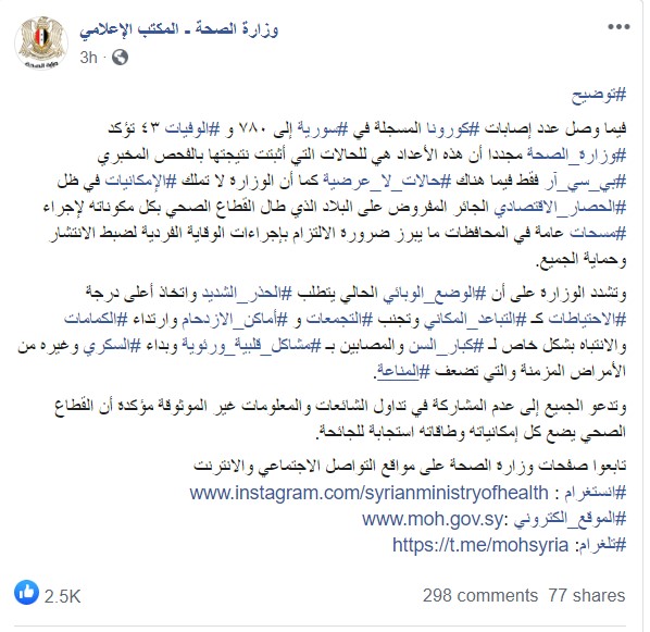 بيان وزارة الصحة التابعة للنظام حول أعداد الإصابات بفيروس كورونا والوفيات 7/9/2020