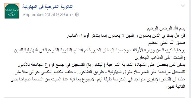 إعلان افتتاح الثانوية الشرعية على المذهب الشيعي في البهلولية بدعم من جمعية البستان