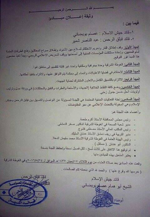 وثيقة إعلان مبادئ بين جيش الإسلام وفيلق الرحمن - اتفاق وقف الاقتتال 2016