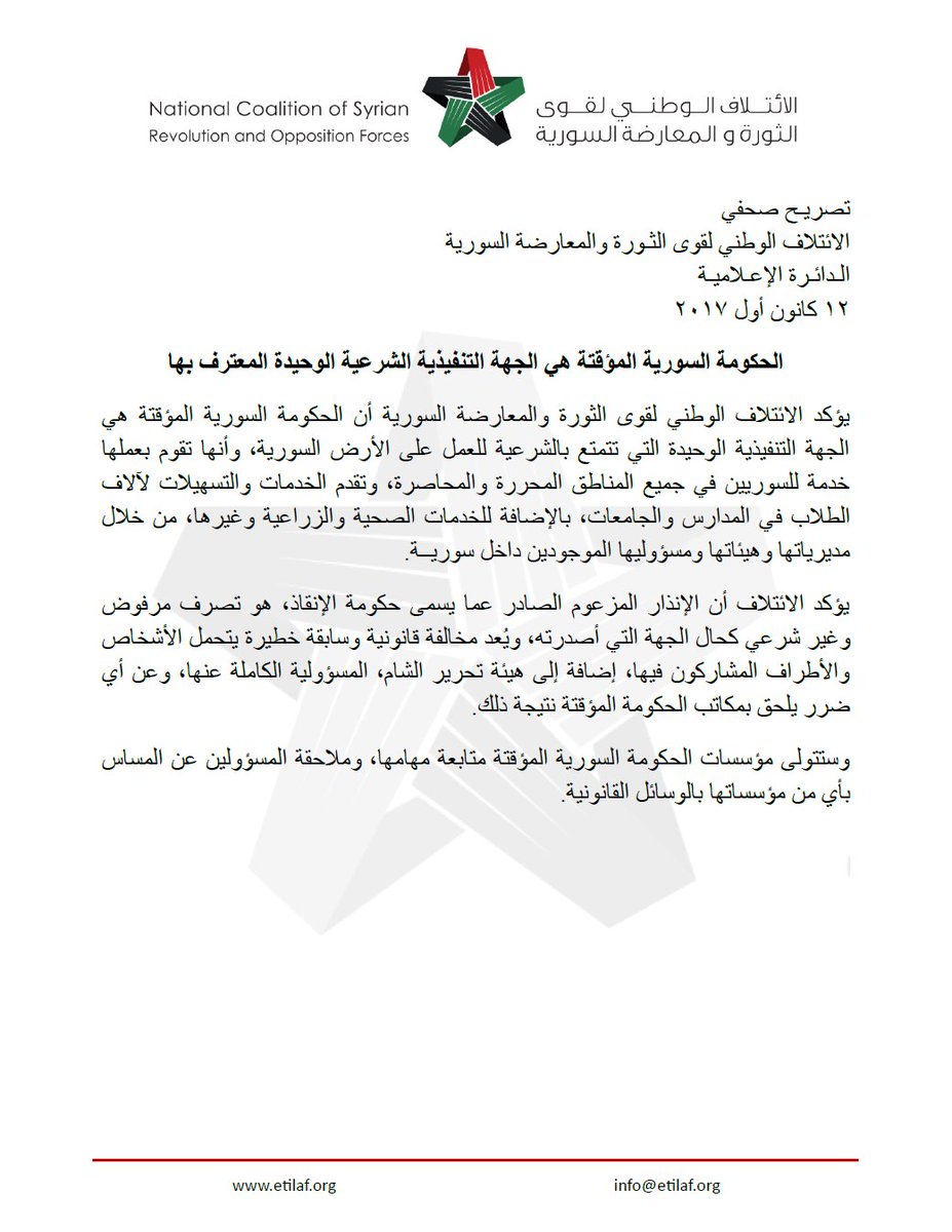 يؤكد الائتلاف أن الإنذار المزعوم الصادر عما يسمى حكومة الإنقاذ، هو تصرف مرفوض وغير شرعي كحال الجهة التي أصدرته، ويُعد مخالفة قانونية وسابقة خطيرة يتحمل الأشخاص والأطراف المشاركون فيها، إضافة إلى هيئة تحرير الشام، المسؤولية الكاملة عنها، وعن أي ضرر يلحق بمكاتب الحكومة المؤقتة نتيجة ذلك.