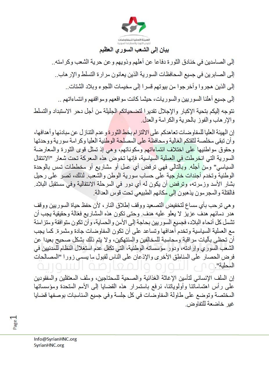إنَّ الهيئة العليا للمفاوضات تعاهدكم على الالتزام بخط الثورة وعدم التنازل عن مبادئها وأهدافها، وأن تبقى مخلصة لثقتكم الغالية ومحافظة على المصلحة الوطنية العليا وكرامة سورية ووحدتها وحقوق مواطنيها على اختلاف انتماءاتهم ومكوناتهم، وهي إذ تمثل قوى الثورة و المعارضة السورية التي انخرطت في العملية السياسية فإنّها تخوض هذه المعركة تحت شعار الانتقال السياسي ومن أجله، وبالتالي فهي ترفض أيَّ عمل أو مشاريع أو مخططات تمس بالوحدة الوطنية، وتخدم أجندات خارجية على حساب سورية الوطن والشعب، ولذلك تصر على رحيل بشار الأسد وزمرته، وترفض أن يكون له أي دور في المرحلة الانتقالية وفي مستقبل البلاد، فالقتلة والمجرمون يذهبون إلى مكانهم الطبيعي تحت قوس العدالة.