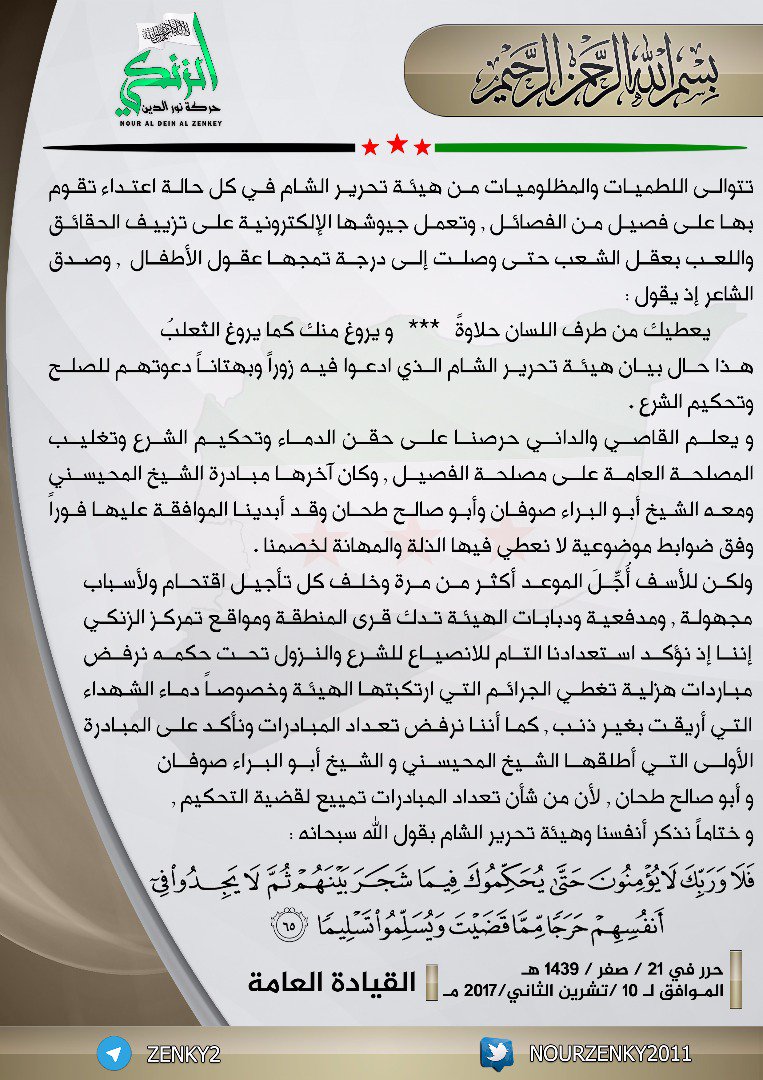 بيان إدانة من حركة نور الدين لاعتداء هيئة تحرير الشام على الفصائل وتزوير الحقائق