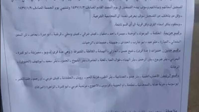 تعميم لتنظيم الدولة الإسلامية (داعش) في القاطع الشمالي لمحافظة الرقة لمن تتجاوز أعمارهم 14 عامًا لتسجيل أسمائهم وبياناتهم في مقراته الأمنية