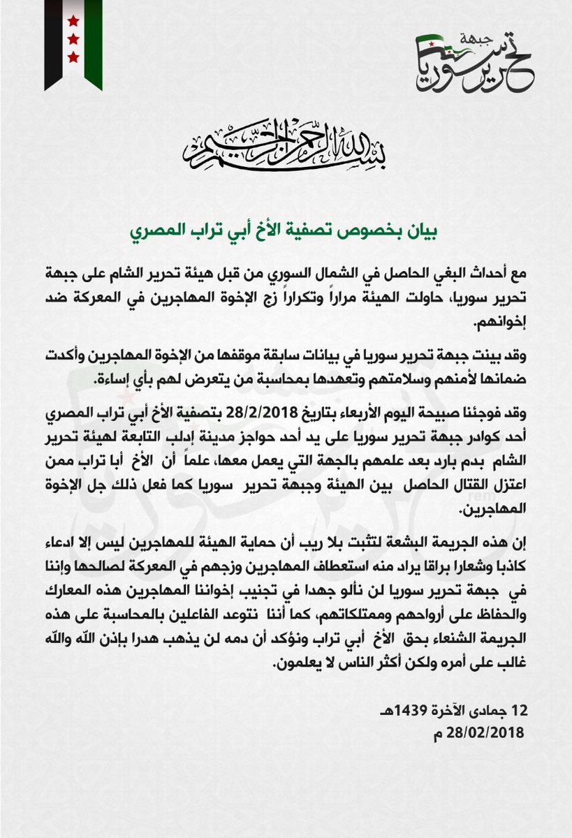 بيان جبهة تحرير سوريا بخصوص تصفية الأخ أبي تراب المصري على يد هيئة تحرير الشام