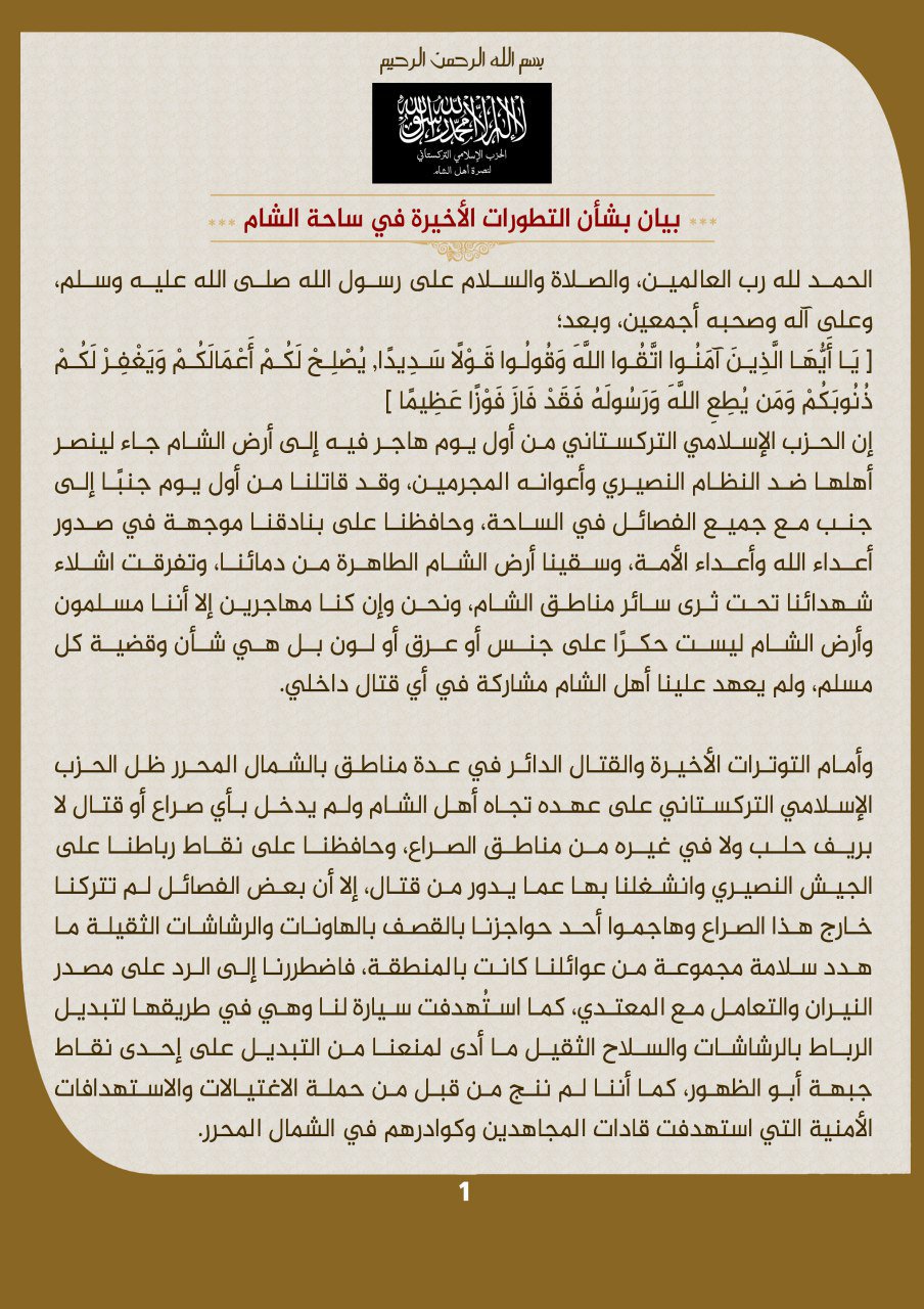 إن الحزب الإسلامي التركستاني من أول يوم هاجر فيه إلى أرض الشام جاء لينصر أهلها ضد النظام النصيري وأعوانه المجرمين، وقد قاتلنا من أول يوم جنبًا إلى جنب مع جميع الفصائل في الساحة، وحافظنا على بنادقنا موجهة في صدور أعداء الله وأعداء الأمة، وسقينا أرض الشام الطاهرة من دمائنا، وتفرقت أشلاء شهدائنا تحت ثرى سائر مناطق الشام، ونحن وإن كنا مهاجرين إلا أننا مسلمون وأرض الشام ليست حكرًا على جنس أو عرق أو لون بل هي شأن وقضية كل مسلم، ولم يعهد علينا أهل الشام مشاركة في أي قتال داخلي.