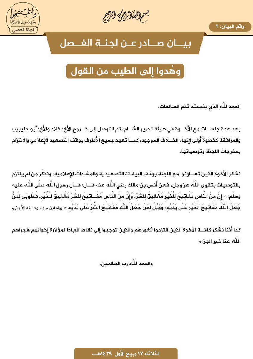 بيان من لجنة الفصل في إدلب حول إفراج هيئة تحرير الشام عن خلاد وأبو جليبيب