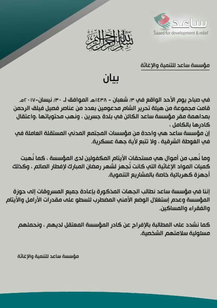 في صباح يوم الأحد الواقع في 3/شعبان 1438هـ الموافق لـ 30/نيسان 2017م، قامت مجموعة من هيئة تحرير الشام مدعومين بعدد من عناصر فيلق الرحمن بمداهمة مقر مؤسسة ساعد الكائن في بلدة جسرين، ونهب محتوياتها، واعتقال كادرها بالكامل.