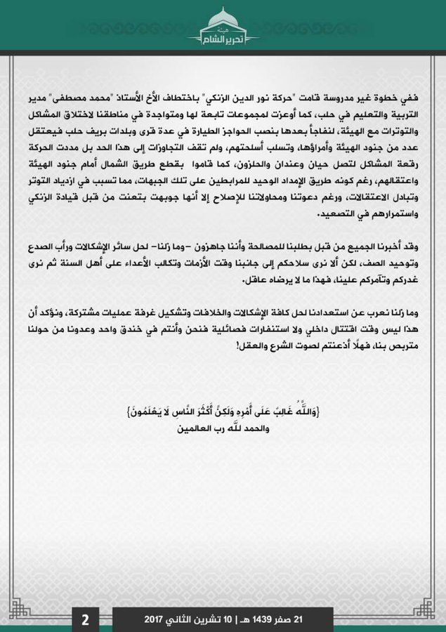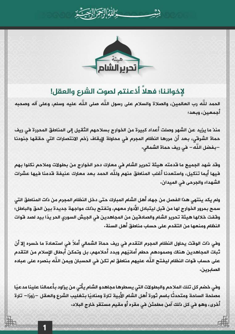 ومما كنا نعبر عن استعدادنا لحل كافة الإشكالات والخلافات تشكيل غرفة عمليات مشتركة ونؤكد أن هذا ليس سعياً لاقتتال داخلي ولا استفراداً فصائلياً فنحن وأنتم في خندق واحد وعدونا من وراءنا مترصد بنا فهلا أذعنتم لصوت الشرع والعقل!