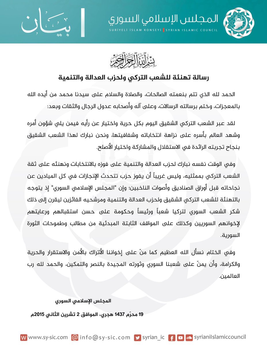 رسالة تهنئة للشعب التركي ولحزب العدالة والتنمية