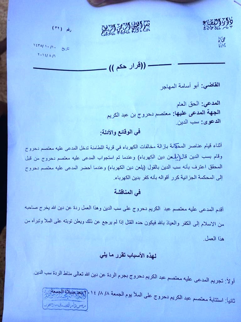 قرار حكم دار القضاء في خان شيخون بتجريم شخص بجرم الردة عن الدين