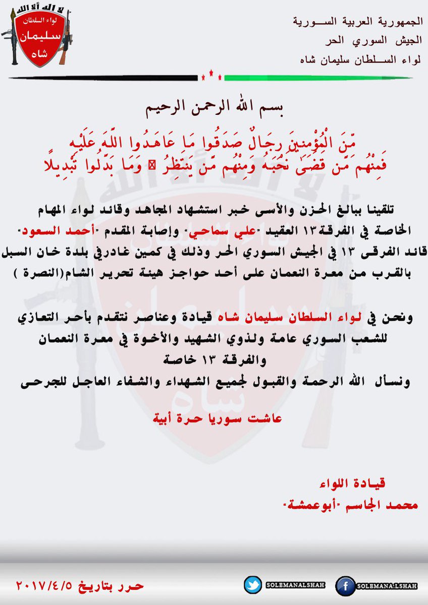 ونحن في **لواء السلطان سليمان شاه** قيادةً وعناصر نتقدم بأحر التعازي للشعب السوري عامة ولذوي الشهيد والإخوة في معرة النعمان والفرقة 13 خاصة.