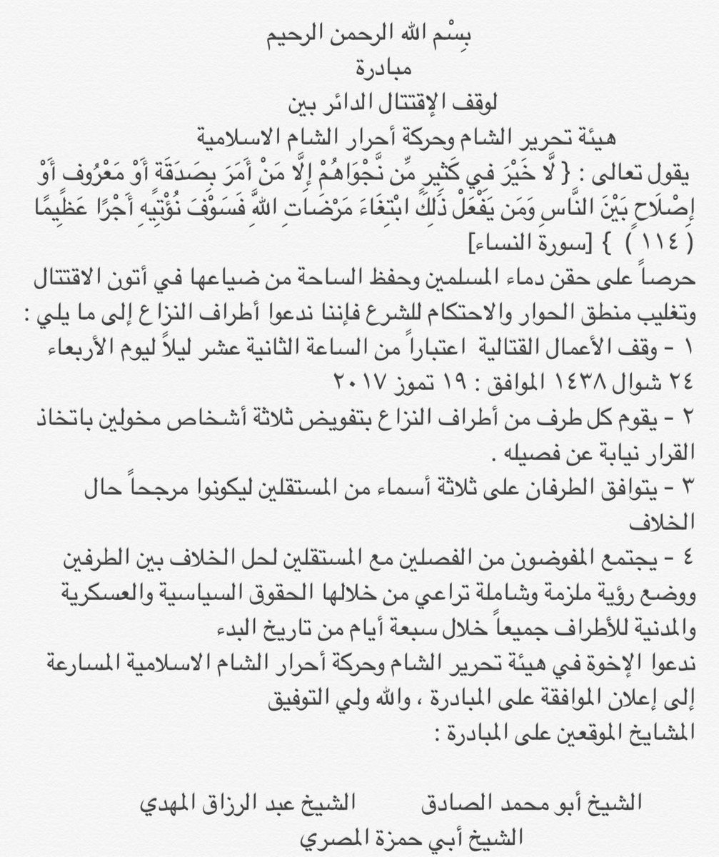 مبادرة المشايخ لوقف الإقتتال الدائر بين هيئة تحرير الشام وحركة أحرار الشام الاسلامية