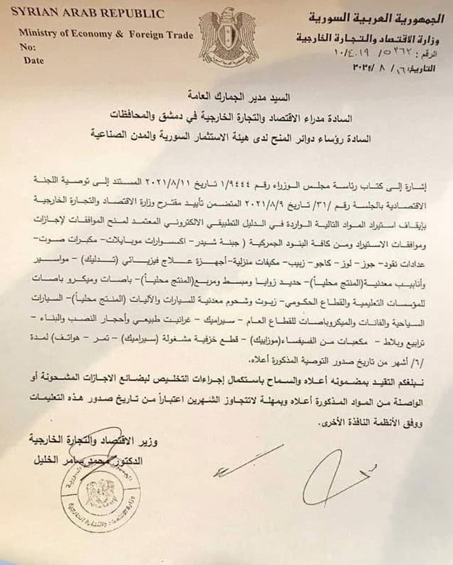 تعميم وزارة الاقتصاد التابعة للنظام بإيقاف استيراد مواد وسلع محددة لـ 6 أشهر