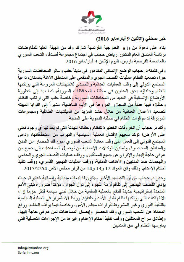 بيان صحفي لرئيس الهيئة العليا للمفاوضات رياض حجاب في اجتماع مجموعة أصدقاء الشعب السوري في باريس حول الوضع المتدهور في مدينة حلب