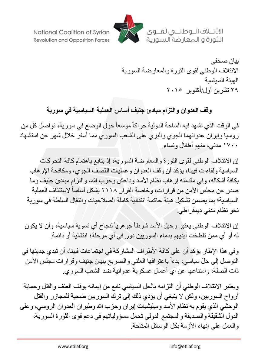 بيان الهيئة السياسية للائتلاف الوطني حول التزام مبادئ جنيف ورحيل الأسد أساسًا للعملية السياسية في سورية
