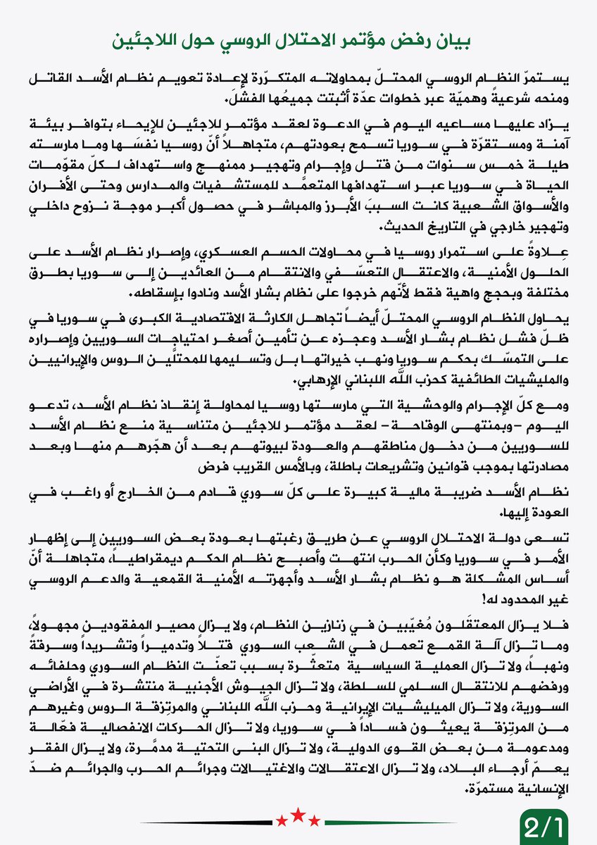 بيان رفض مؤتمر الاحتلال الروسي حول اللاجئين