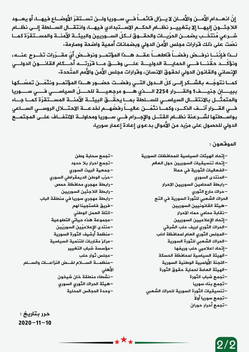 كما نتوجه بالشكر إلى كل الدول التي رفضت حضور هذا المؤتمر ونثمن تمسكها ببيان جنيف 1 والقرار 2254 الذي هو مرجعية للحل السياسي في سوريا والمتمثل بالانتقال السياسي للسلطة بما يحقق البيئة الآمنة المستقرة كما جاء في القرار آنف الذكر، وكما نثمن عالياً رفضهم لخدعة الاحتلال الروسي الساعي بواسطتها لشرعنة نظام القتل والإجرام في سوريا ومحاولة الالتفاف على المجتمع الدولي للحصول على مزيد من الأموال بدعوى إعادة إعمار سوريا.