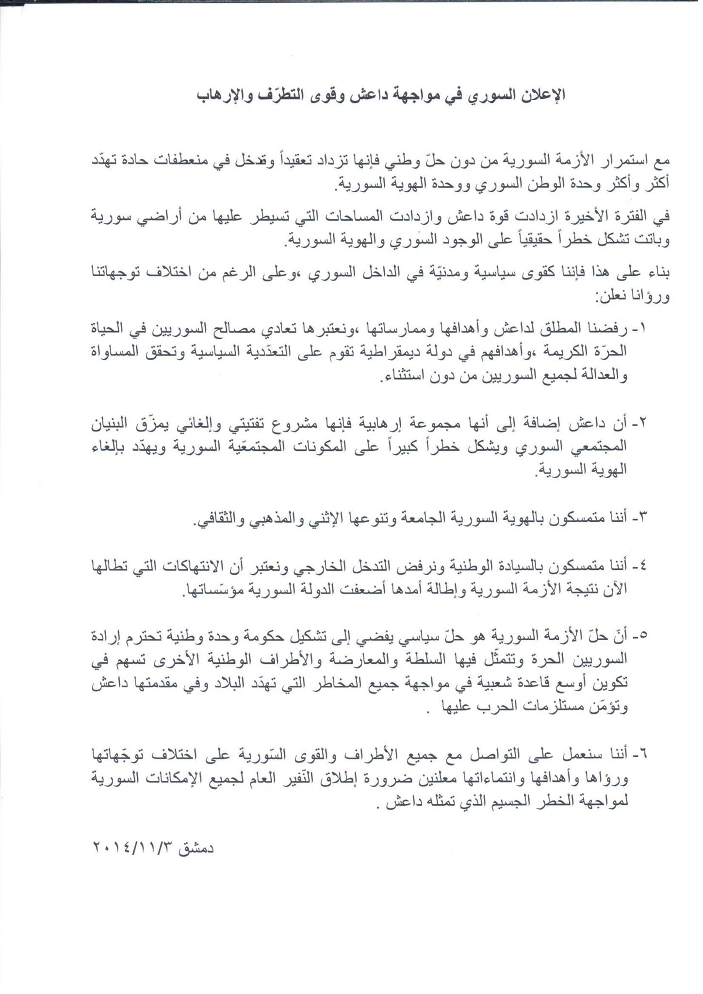 الإعلان السوري في مواجهة داعش وقوى التطرف والإرهاب
