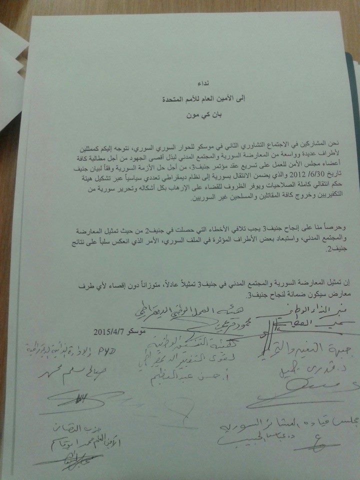 نداء مشاركي الاجتماع التشاوري الثاني في موسكو إلى الأمين العام للأمم المتحدة لعقد مؤتمر جنيف 3