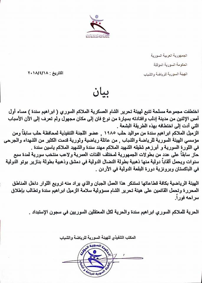 بيان الهيئة السورية للرياضة والشباب حول خطف الملاكم السوري إبراهيم سندة من قبل هيئة تحرير الشام