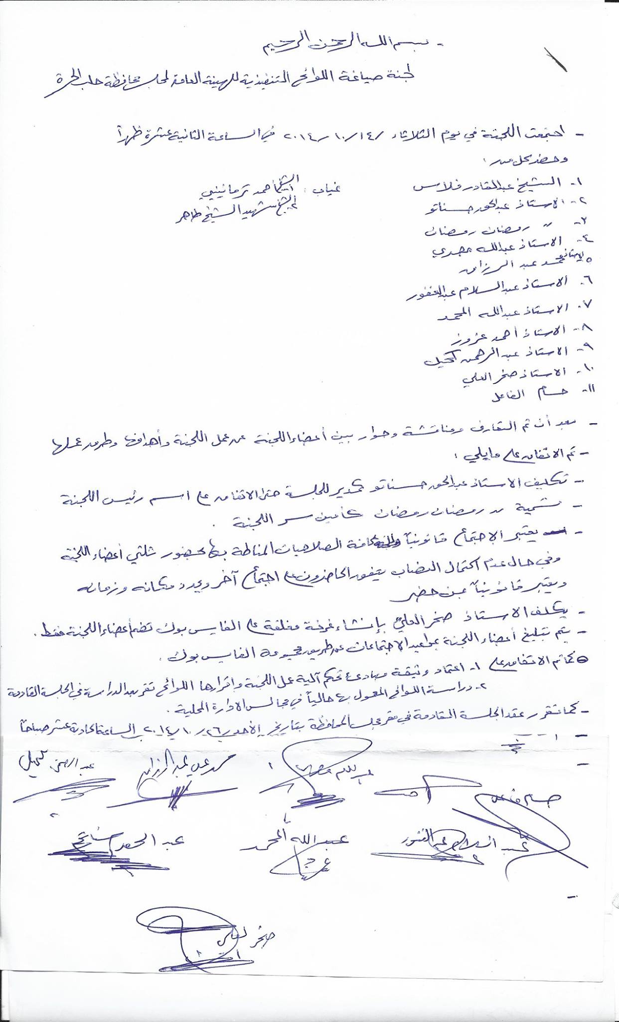 محضر اجتماع لجنة صياغة اللوائح التنفيذية للهيئة العامة لمجلس محافظة حلب الحرة
