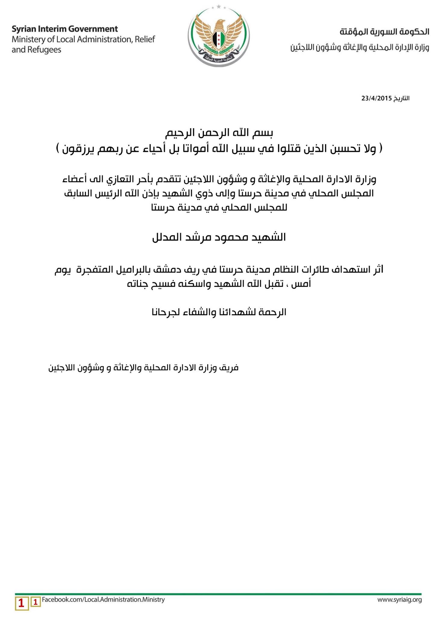 بيان وزارة الإدارة المحلية في الحكومة المؤقتة للتعزية برئيس المجلس المحلي في مدينة حرستا الذي قتل بقصف بالبراميل المتفجرة