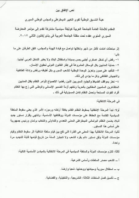 نص الاتفاق بين هيئة التنسيق الوطنية لقوى التغيير الديمقراطي والمجلس الوطني السوري المقدم للأمانة العامة للجامعة العربية كوثيقة سياسية مشتركة تقدم إلى مؤتمر المعارضة السوري المنوي عقده تحت مظلة الجامعة العربية في يناير/كانون الثاني 2012