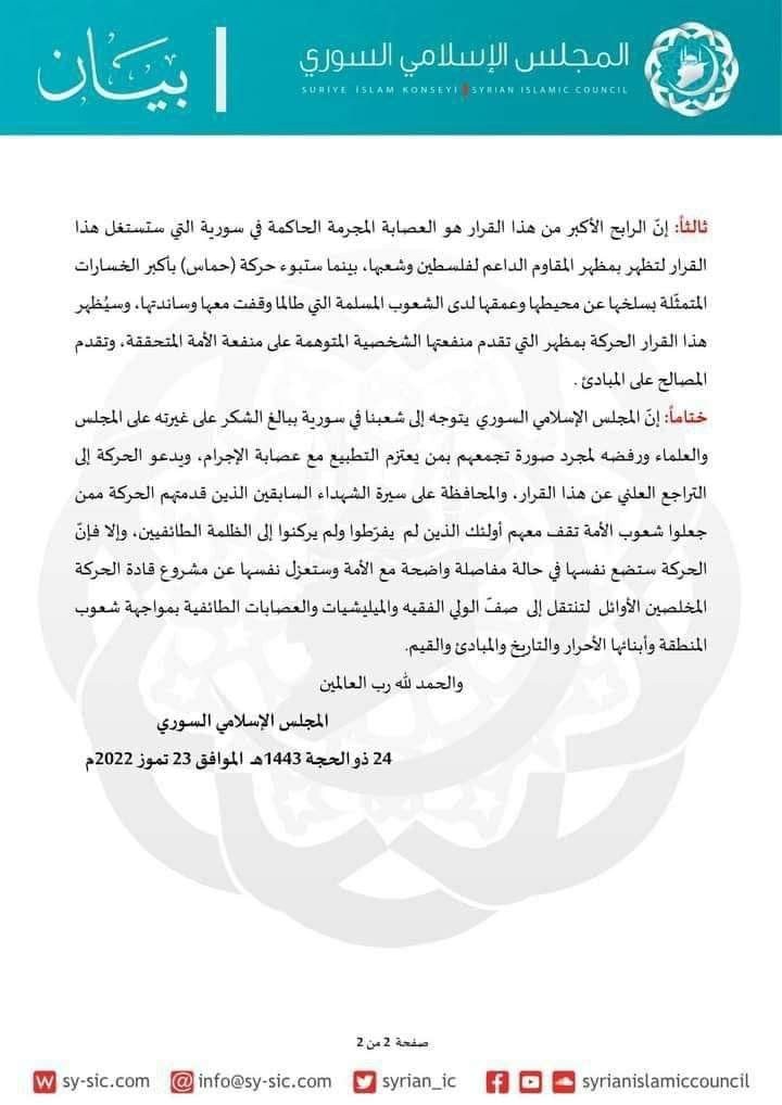 إنّ المجلس الإسلامي السوري يتوجه إلى شعبنا في سورية ببالغ الشكر على غيرته على المجلس والعلماء ورفضه لمجرد صورة تجمعهم بمن يعتزم التطبيع مع عصابة الإجرام، و يدعو الحركة إلى التراجع العلني عن هذا القرار، والمحافظة على سيرة الشهداء السابقين الذين قدمتهم الحركة ممن جعلوا شعوب الأمة تقف معهم أولئك الذين لم يفرّطوا ولم يركنوا إلى الظلمة الطائفيين، وإلا فإنّ الحركة ستضع نفسها في حالة مفاصلة واضحة مع الأمة وستنعزل عن مشروع قادة الحركة المخلصين الأوائل لتنتقل إلى صفّ الولي الفقيه والميليشيات والعصابات الطائفية بمواجهة شعوب المنطقة وأبنائها الأحرار والتاريخ والمبادئ والقيم.