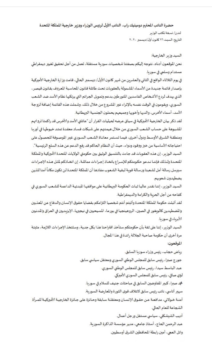 رسالة شخصيات سياسية سورية إلى النائب العام الأول لرئيس الحكومة البريطانية ووزير الخارجية لإدراج أسماء الأسد على قائمة عقوبات اقتصادية أسوة بقانون قيصر