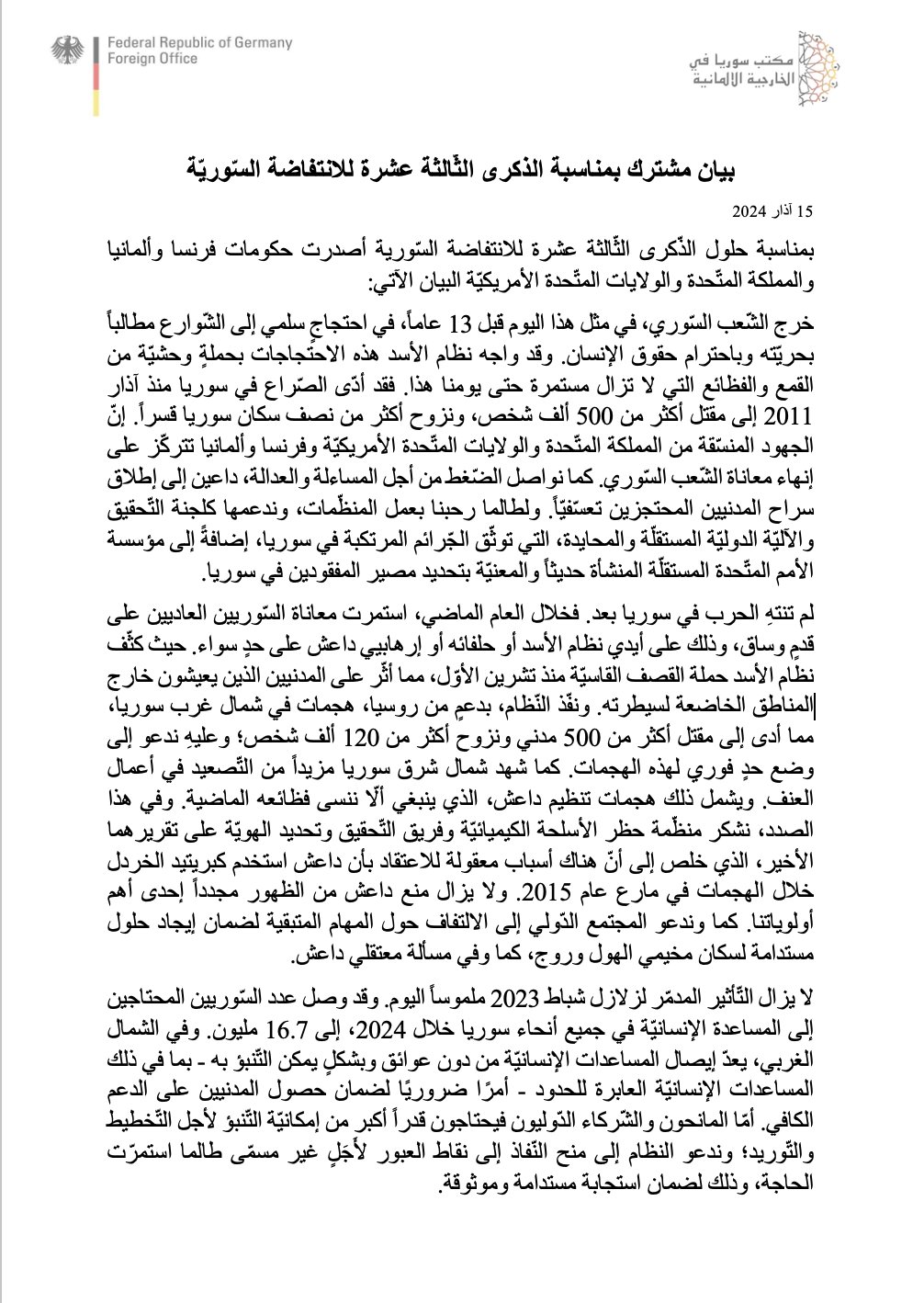 بيان أمريكي بريطاني ألماني فرنسي مشترك بمناسبة الذكرى الثالثة عشر للثورة السورية
