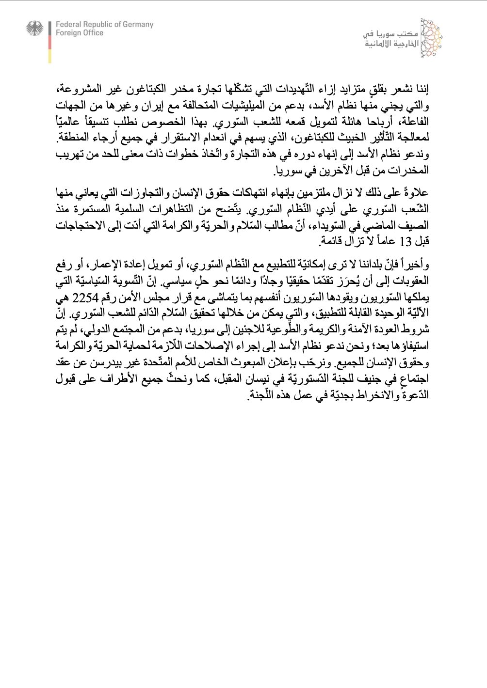 لا ترى دولنا أي إمكانية للتطبيع مع نظام الأسد ولن تمول إعادة الإعمار أو ترفع العقوبات قبل أن يتم إحراز أي تقدم حقيقي وهادف ودائم نحو الحل السياسي. وتبقى التسوية السياسية التي يمتلكها السوريون ويقودونها بما يتماشى مع قرار مجلس الأمن رقم 2254 الآلية الوحيدة القابلة للتطبيق والقادرة على تحقيق السلام الدائم للشعب السوري. لم يتم بعد استيفاء شروط العودة الآمنة والكريمة والطوعية للاجئين إلى سوريا بدعم من المجتمع الدولي، ونحن ندعو نظام الأسد إلى إجراء الإصلاحات اللازمة لضمان حماية الحرية والكرامة وحقوق الإنسان للجميع. ونرحب بإعلان المبعوث الخاص للأمم المتحدة جير بيدرسن عن عقد اجتماع للجنة الدستورية في نيسان/أبريل في جنيف ونحث كافة الأطراف على قبول الدعوة والانخراط بجدية في عمل اللجنة.