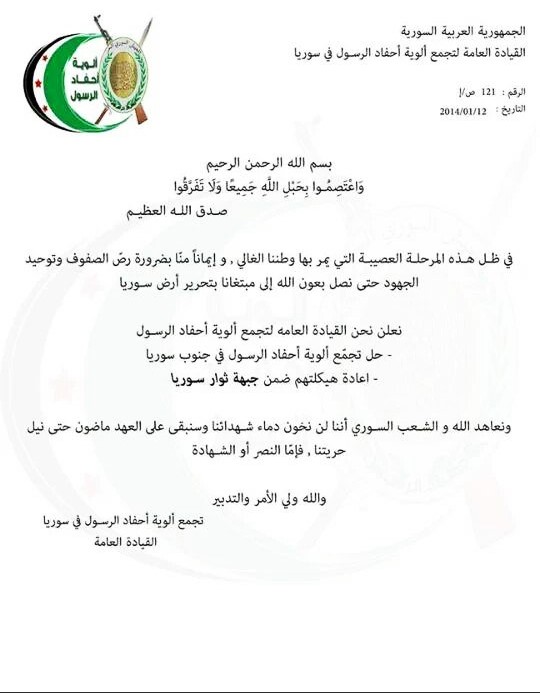 حل تجمّع ألوية أحفاد الرسول في الجنوب و اعادة هيكلتهم ضمن جبهة ثوار سوريا