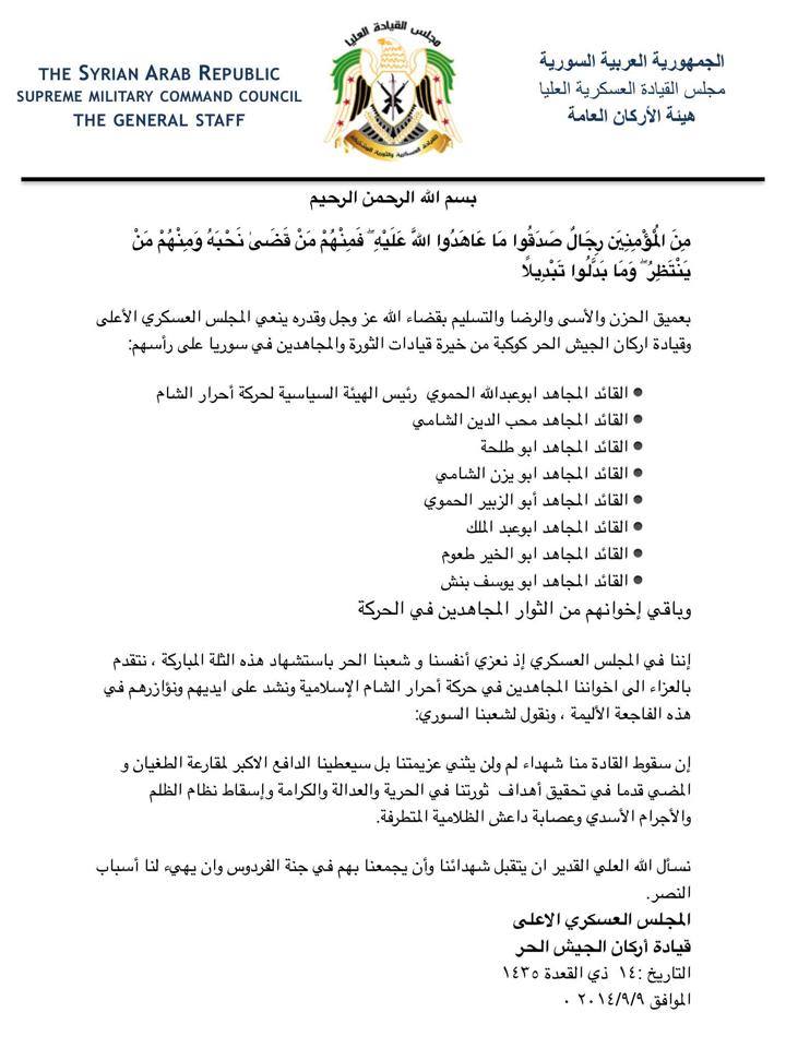 بيان من هيئة الأركان العامة للجيش السوري الحر يعزي بمقتل قادة حركة أحرار الشام الإسلامية