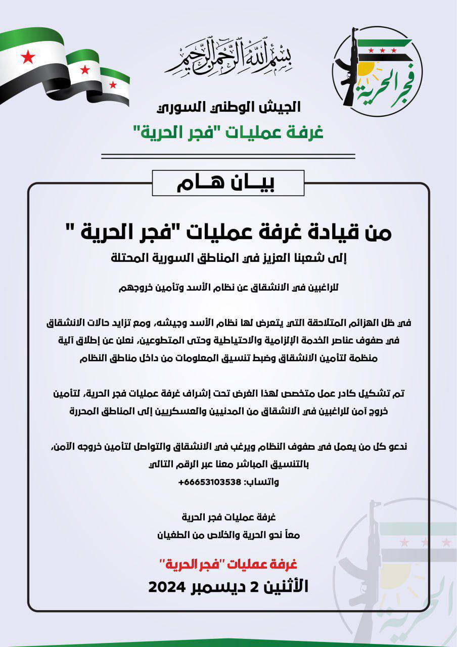 أصدرت غرفة عمليات "فجر الحرية" بيانًا أعلنت فيه إطلاق آلية منظمة لتأمين الراغبين في الانشقاق عن نظام الأسد وضبط تنسيق المعلومات داخل مناطق النظام.