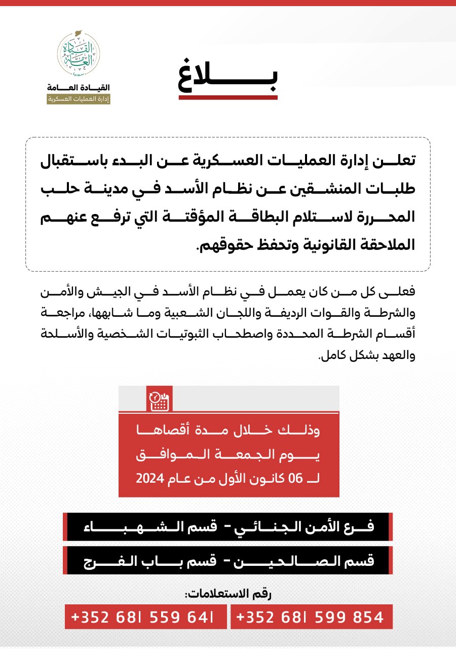 إلى جميع من بقي في مدينة حلب المحررة من جنود النظام في الجيش والأمن والشرطة مراجعة أقسام الشرطة المحددة لاستكمال إجراءاتهم وحمايتهم قانونيا.
