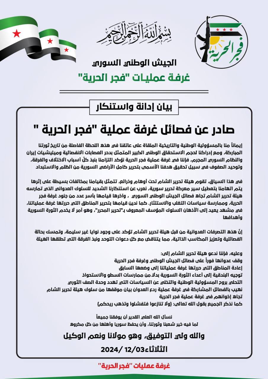 بيان إدانة وإستنكار صادر عن غرفة عملية #فجر-الحرية اتجاه السلوكيات العدوانية لهيئة تحرير الشام في ظل إنشغال مكونات الجيش الوطني السوري بمعارك التحرير من نظام الأسد وميليشيات قسد الارهابية
