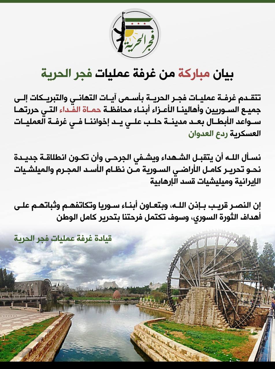 بيان || مباركة من غرفة عمليات "فجر الحرية" لجميع السوريين وأهالينا الأعزاء أبناء محافظة " حماة " الفداء.