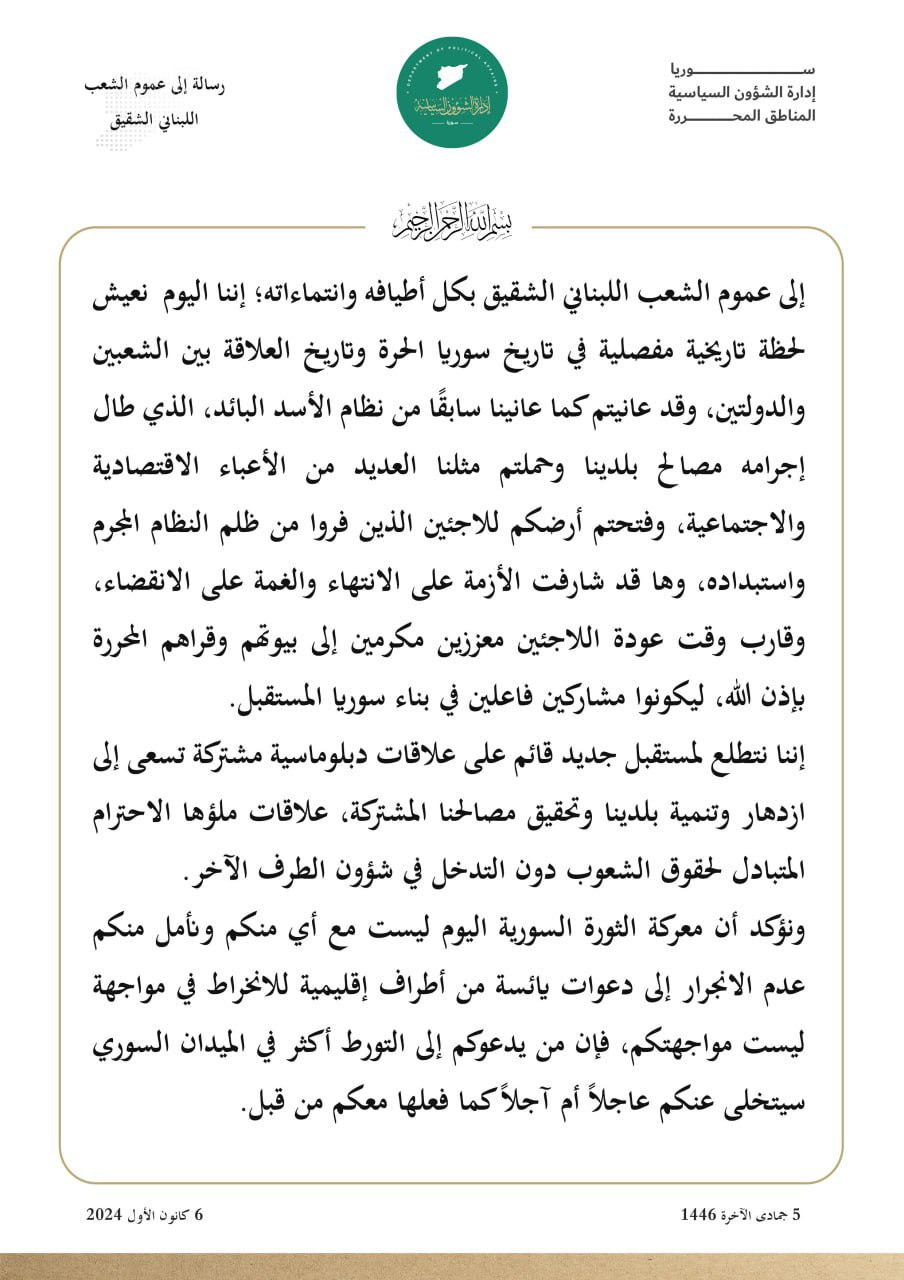 رسالة إلى عموم الشعب اللبناني الشقيق