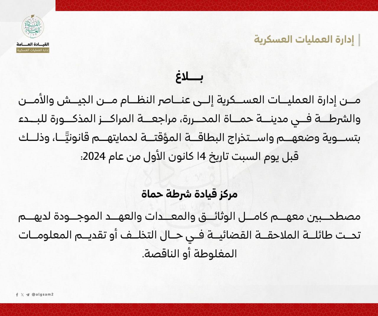 بلاغ إلى عناصر النظام من الجيش والأمن والشرطة في مدينة حماة المحررة