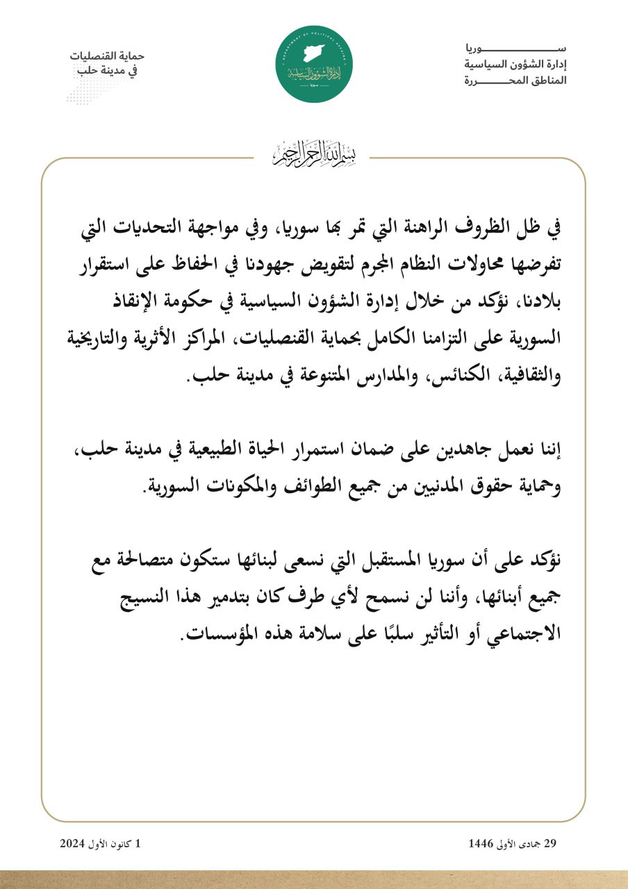 بيان "إدارة الشؤون السياسية" حول حماية القنصليات في مدينة حلب