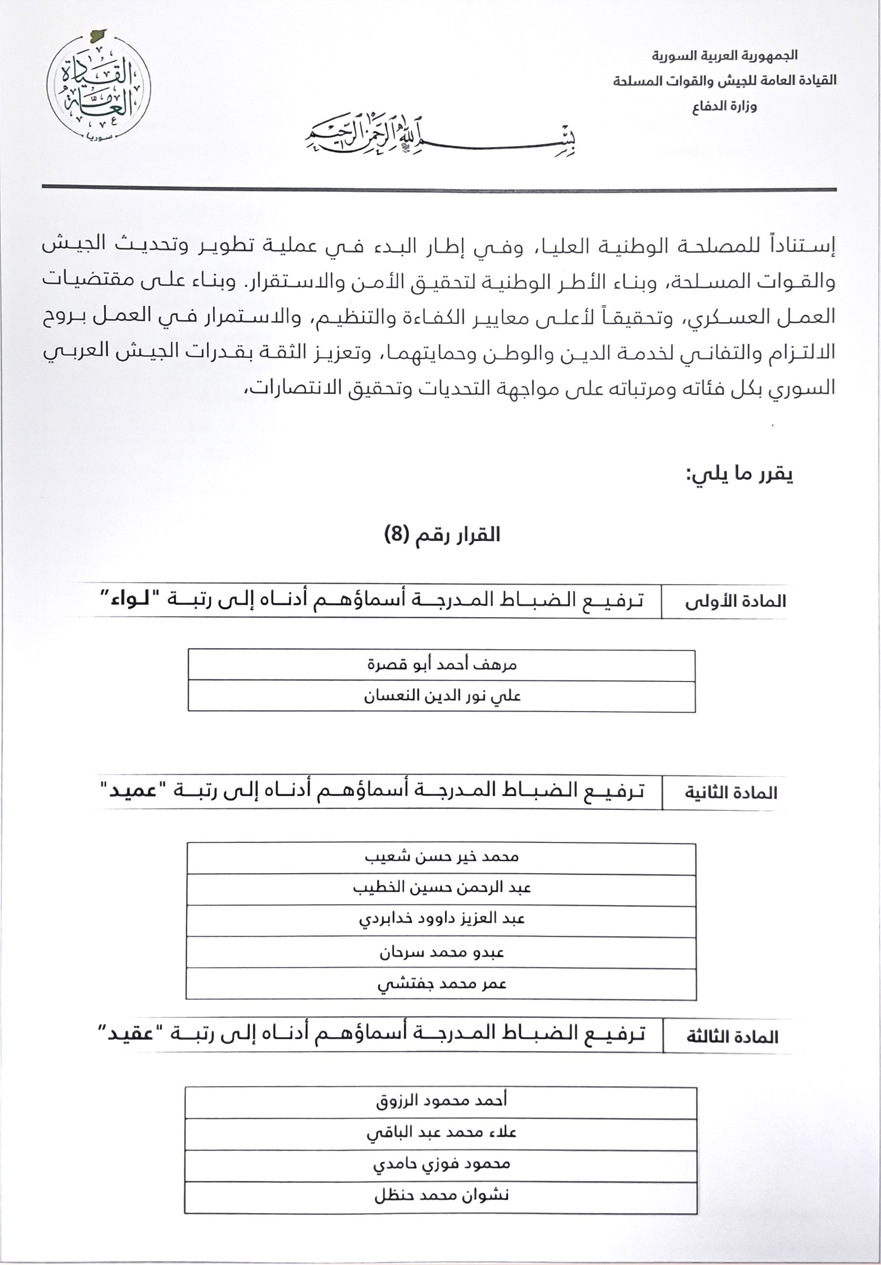 القيادة العامة في سوريا تعلن ترفيع الضباط المدرجة أسماؤهم وفق النشرة الأولى من الترفيعات.