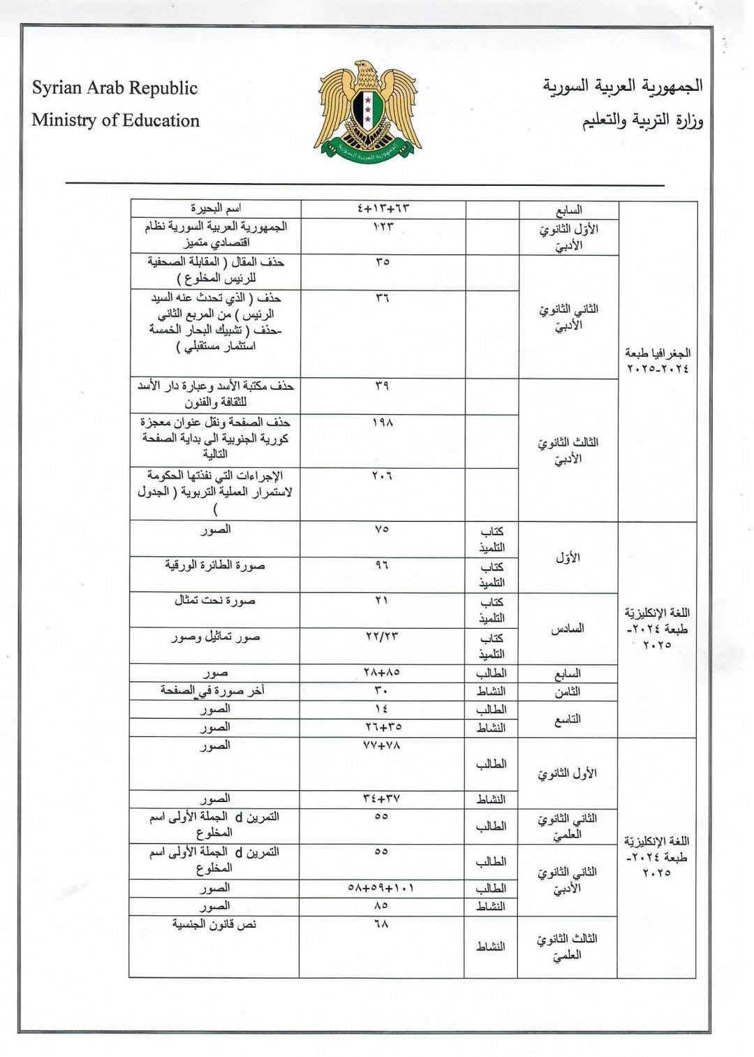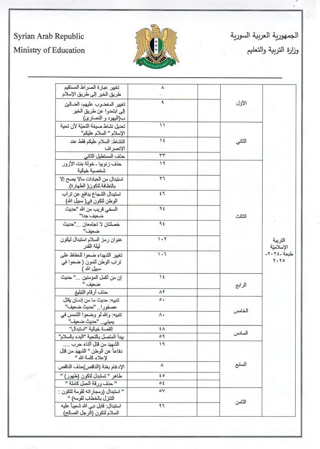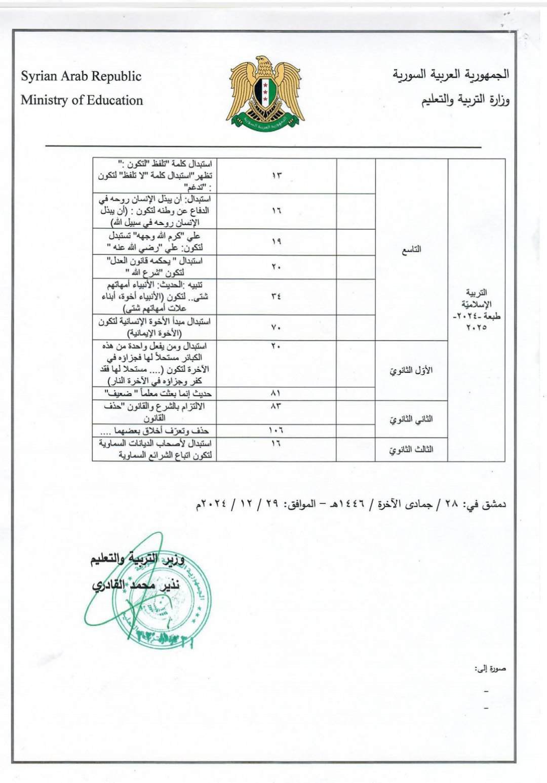 إجراء تعديلات على المناهج الدراسية من الصف الأول وحتى الثالث الثانوي في الجمهورية العربية السورية للعام الدراسي 2025م.