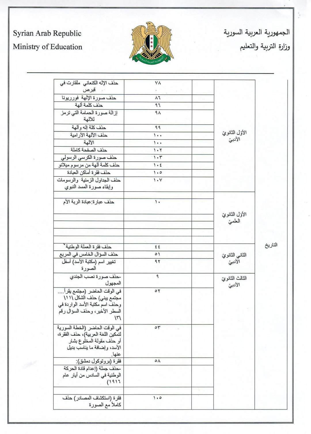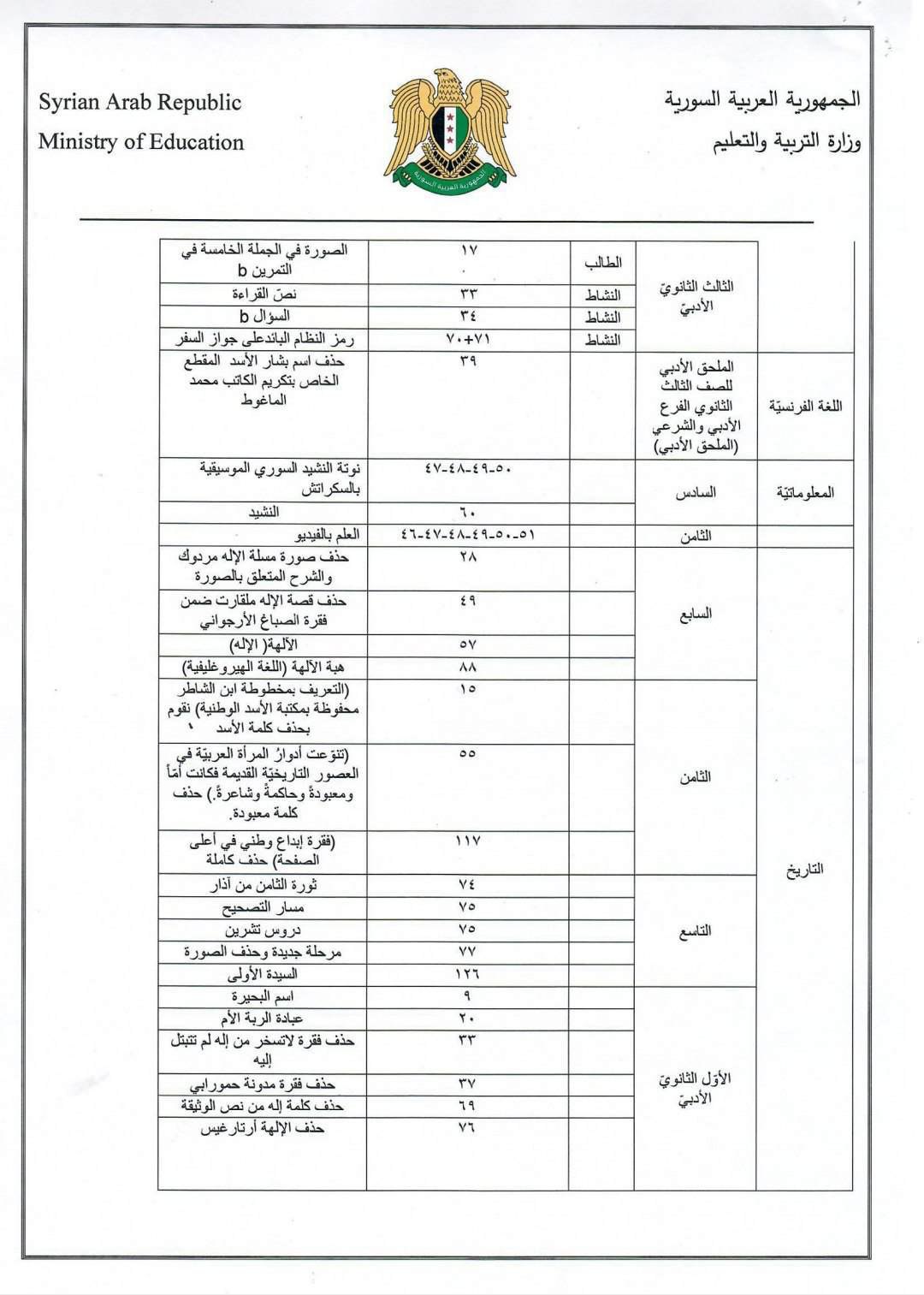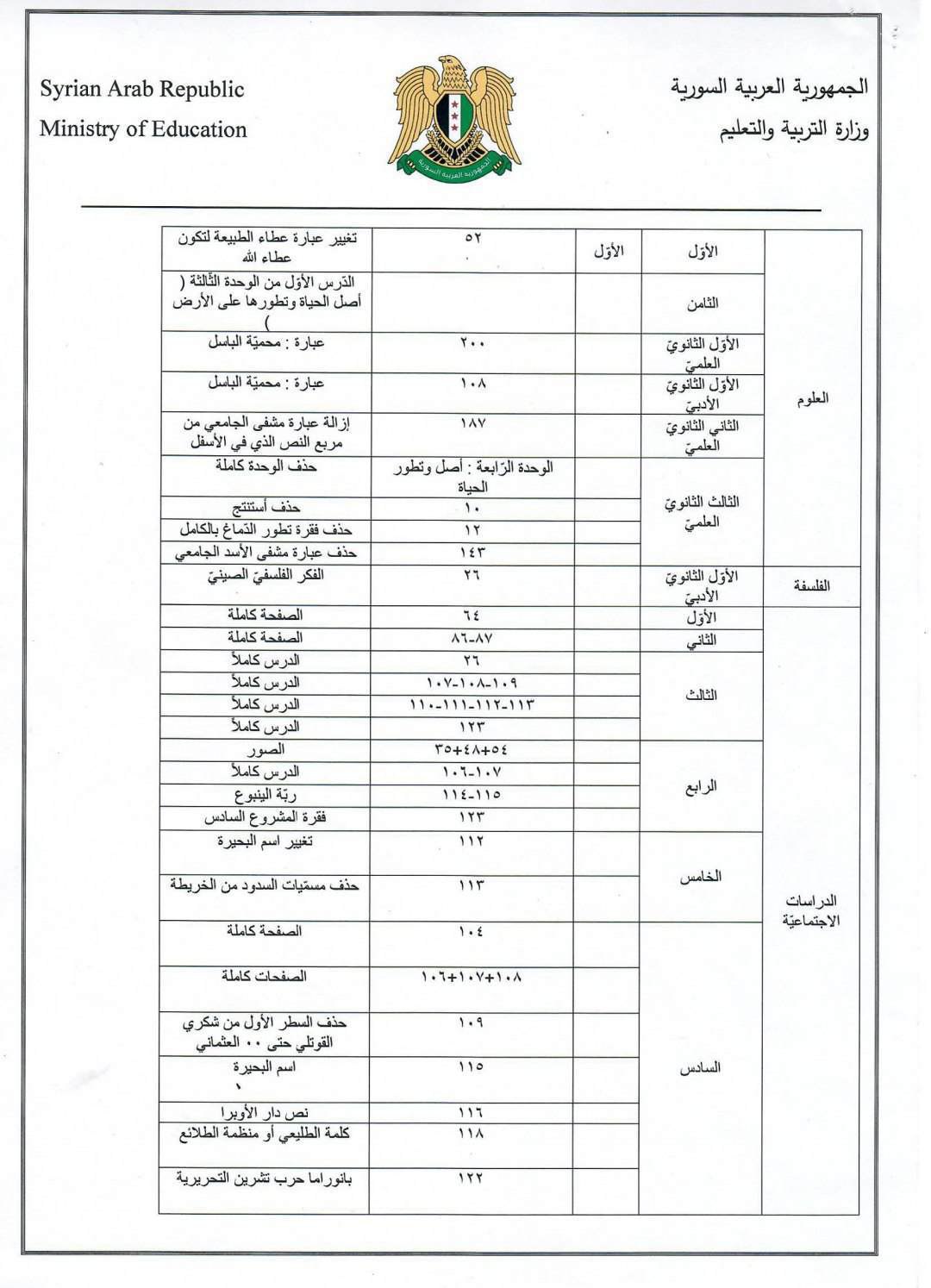 إجراء تعديلات على المناهج الدراسية من الصف الأول وحتى الثالث الثانوي في الجمهورية العربية السورية للعام الدراسي 2025م.