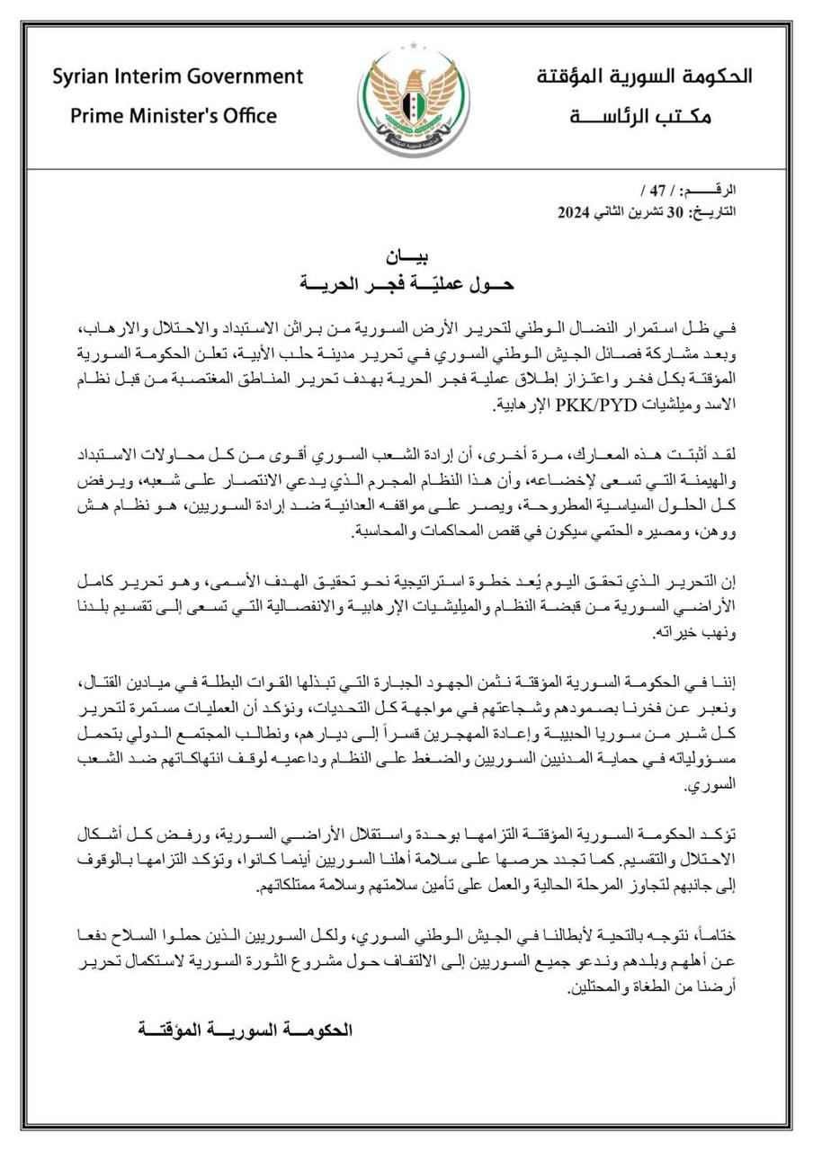 بيان الحكومة السورية المؤقتة حول عملية فجر الحرية