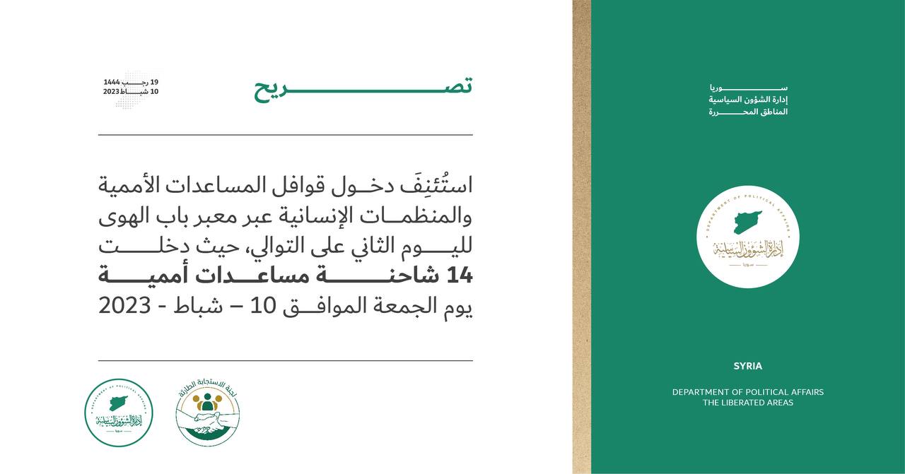 استئنف دخول قوافل المساعدات الأممية والمنظمات الإنسانية عبر معبر باب الهوى لليوم الثاني على التوالي، حيث دخلت
