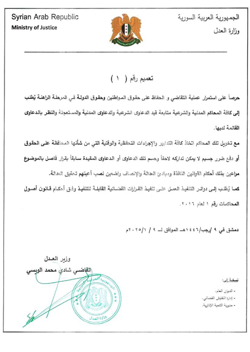 حرصًا على استمرار عملية التقاضي و الحفاظ على حقوق المواطنين وحقوق الدولة في المرحلة الراهنة يطلب إلى كافة المحاكم المدنية والشرعية متابعة قيد الدعاوى الشرعية والدعاوى المدنية والمستعجلة والنظر بالدعاوى القائمة لديها.