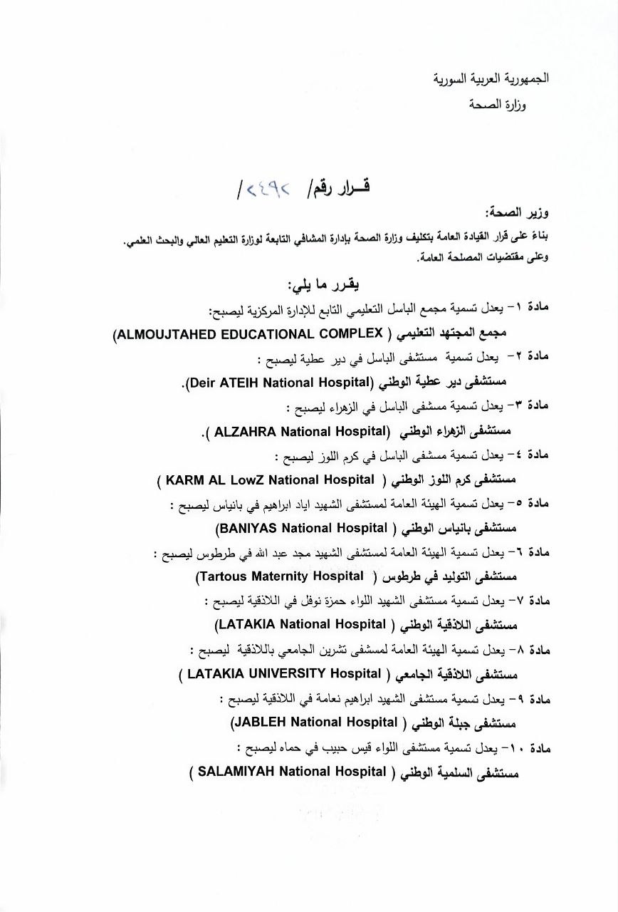 مادة 3- يعدل تسمية مسشفى الباسل في الزهراء ليصبح :