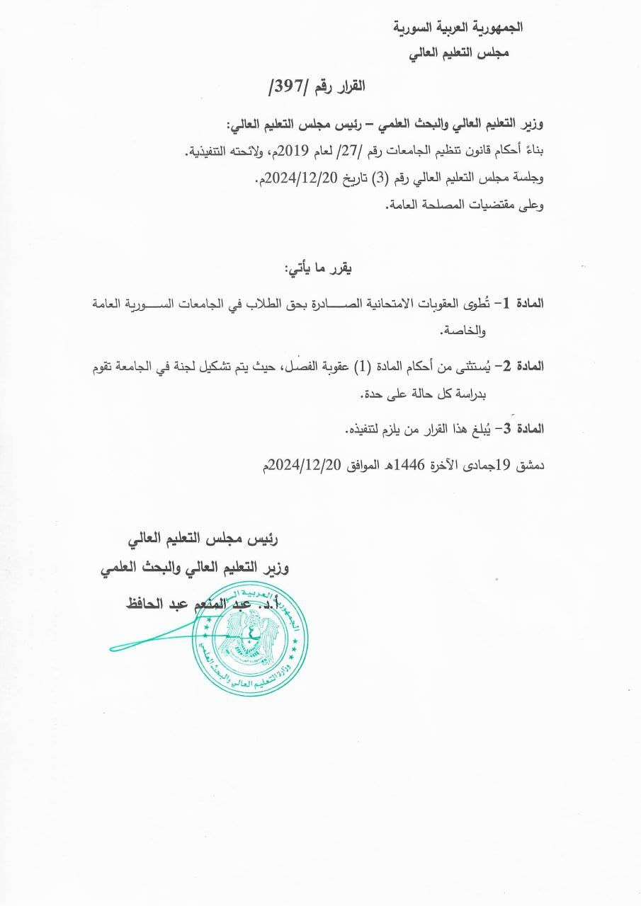 وزارة التعليم العالي: قرار بطي العقوبات الامتحانية الصادرة بحق الطلاب في الجامعات السورية العامة والخاصة.