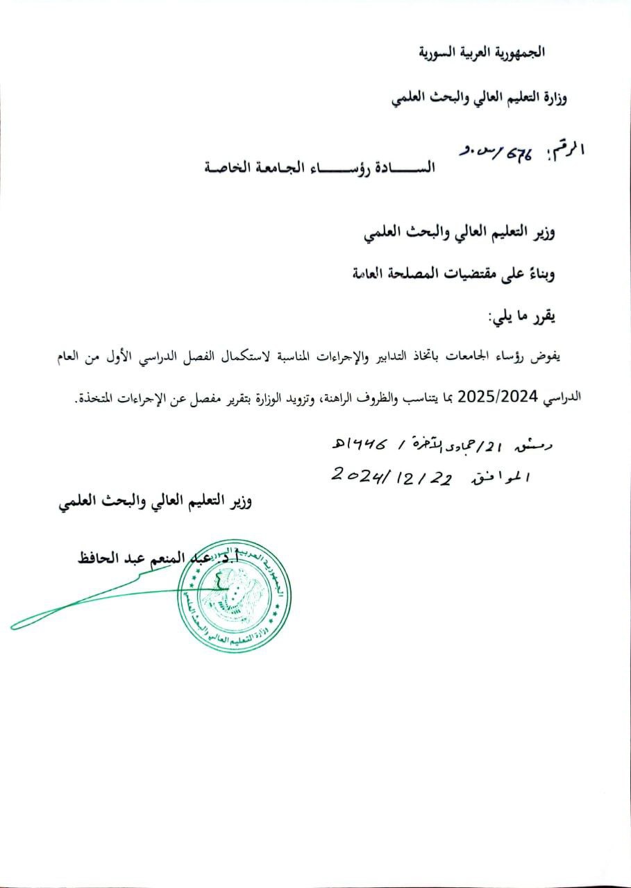 وزارة التعليم العالي- الإدارة السورية الجديدة