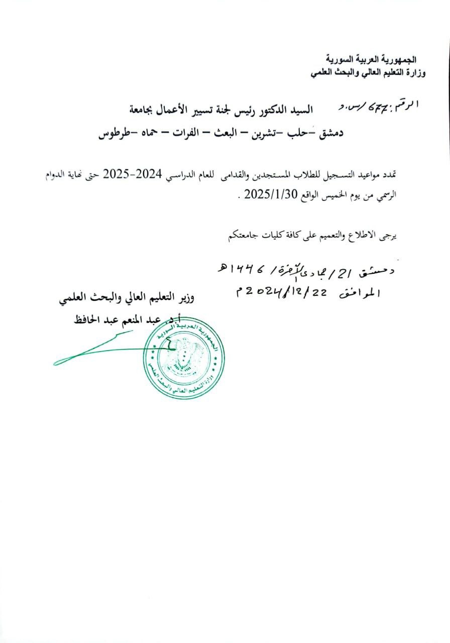 تحدد مواعيد التسجيل للطلاب المستجدين والقدامى للعام الدراسي 2024-2025 حتى نهاية الدوام
